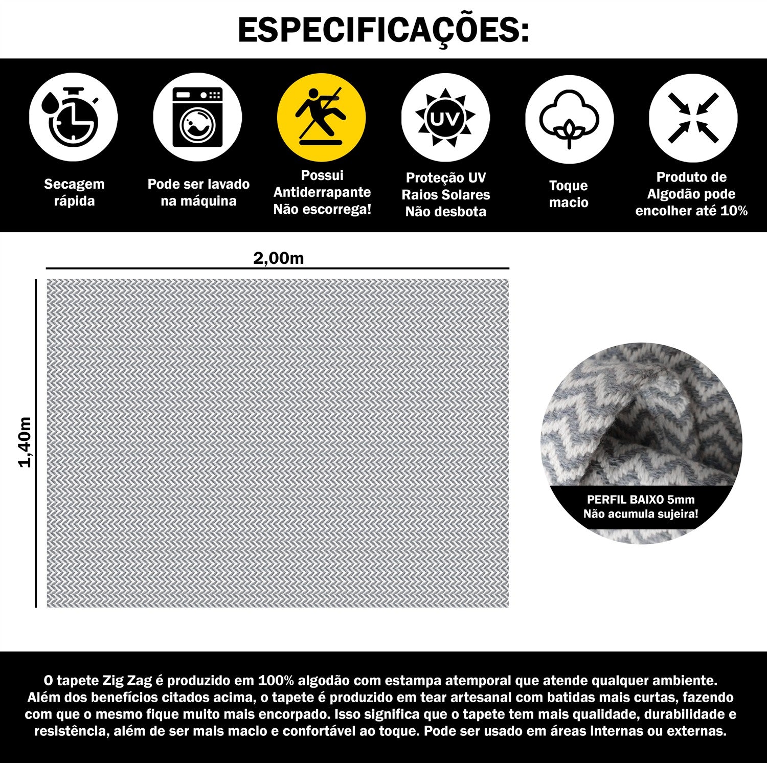Tapete para Sala e Quarto 200x140cm Antiderrapante Zig Zag Cinza
