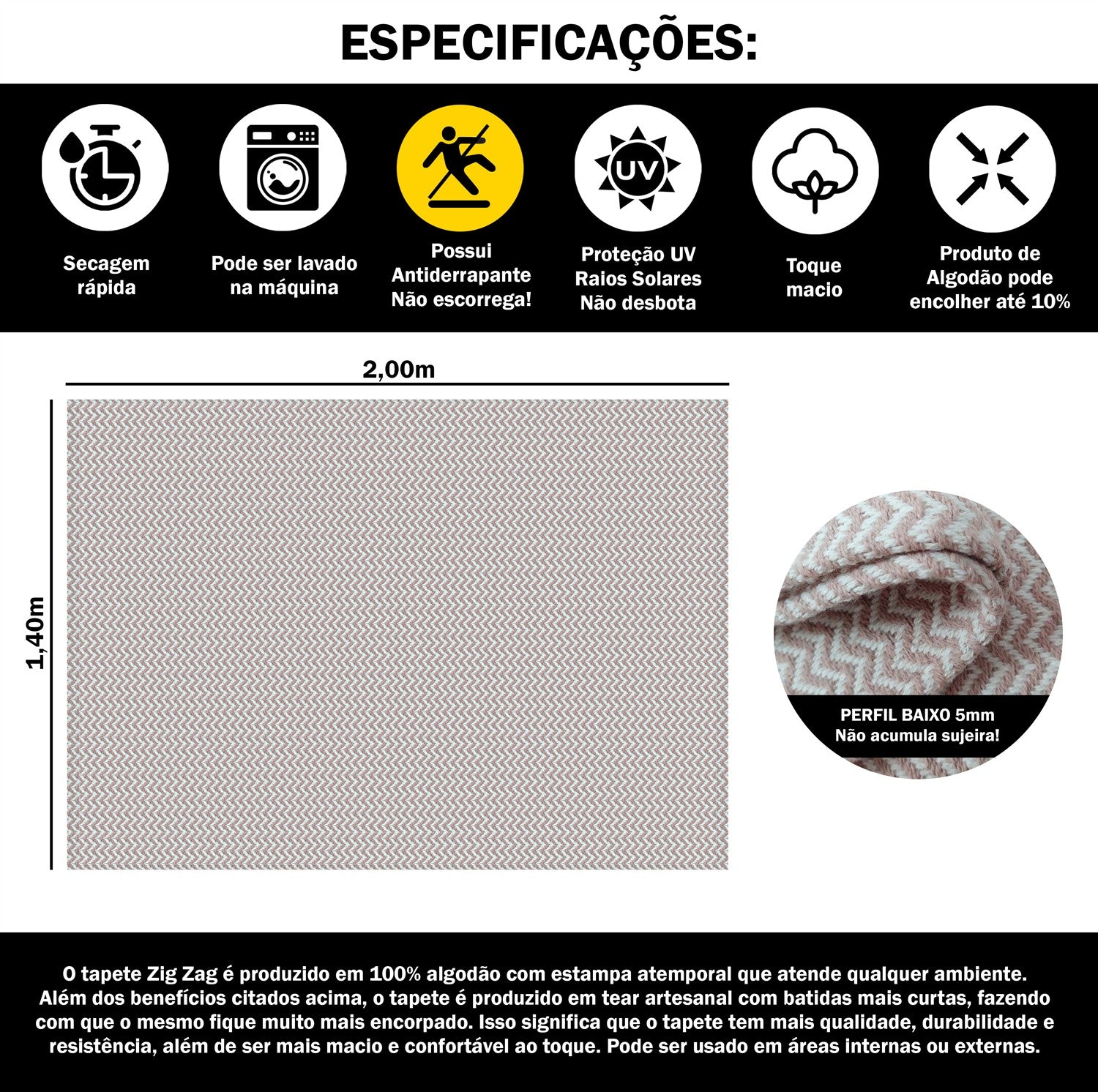 Tapete para Sala e Quarto 200x140cm Antiderrapante Zig Zag Nude