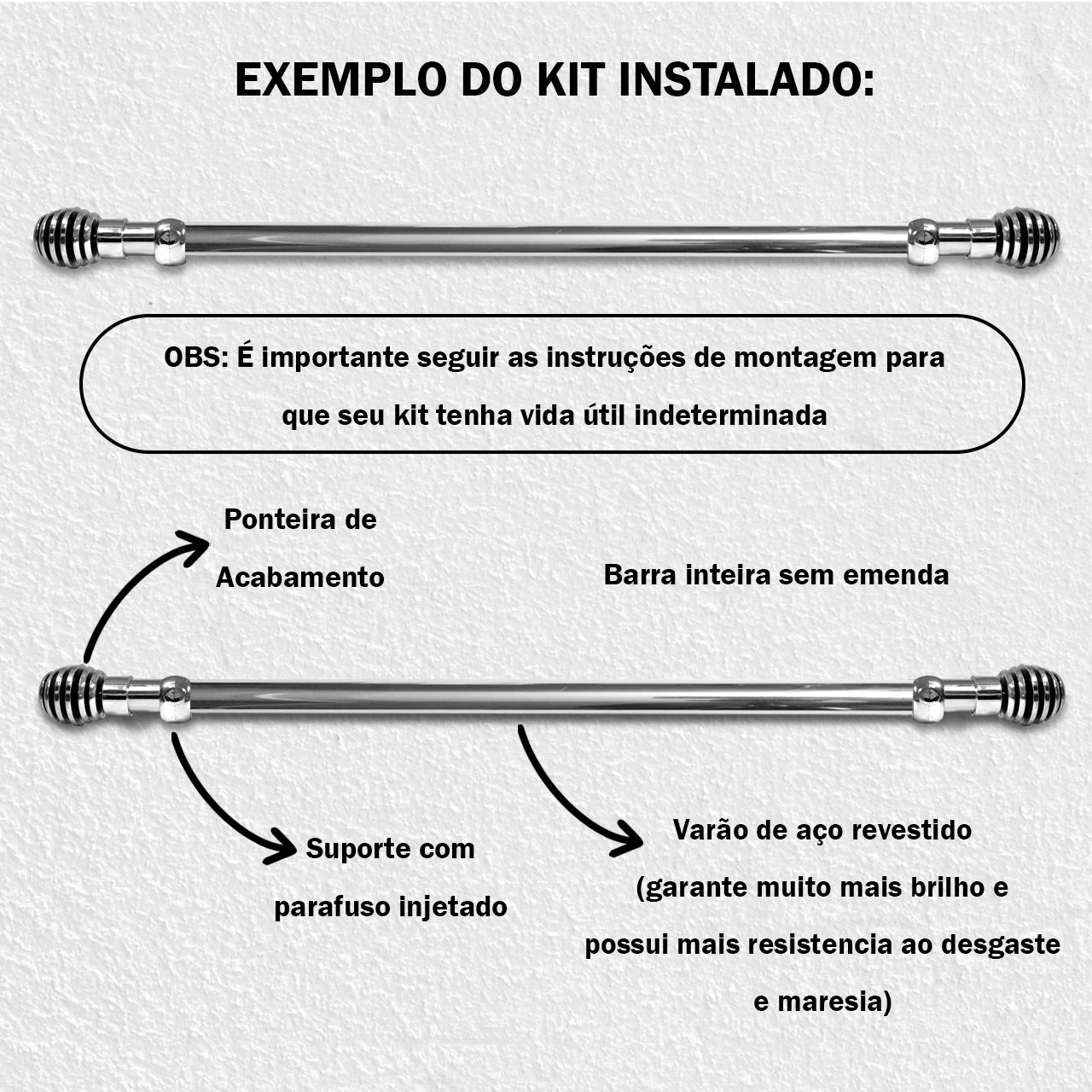 COMPOSIÇÃO: Varão fabricado em Aço Revestido. Demais Acessórios em Polipropileno de Alta Densidade.